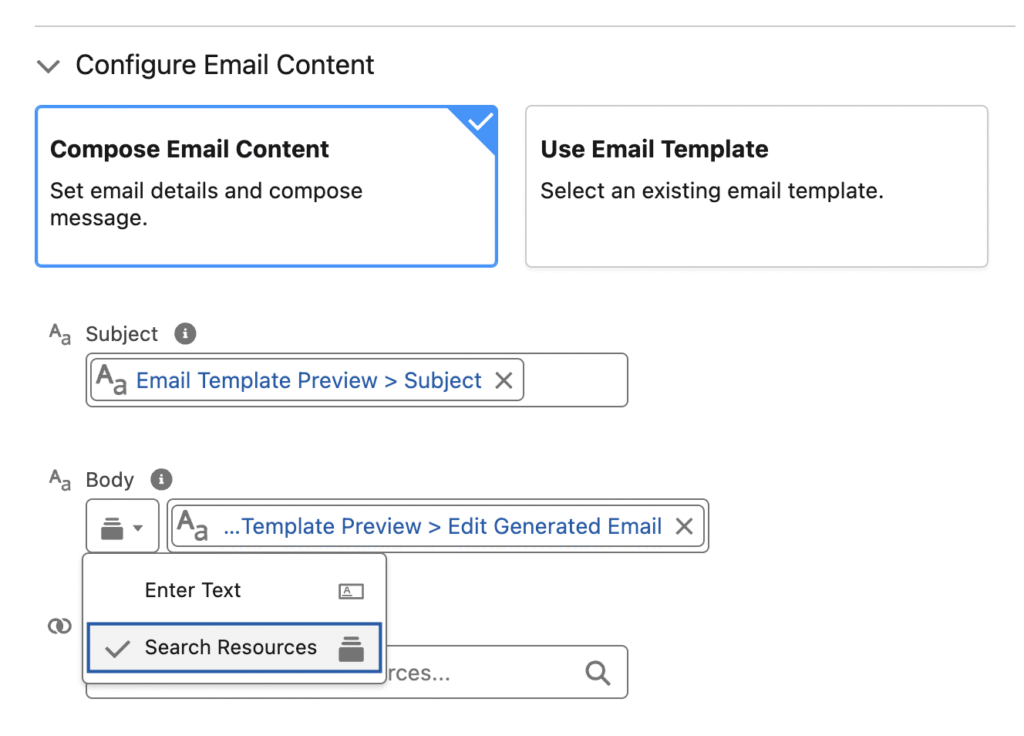 Screen -> Email Template Preview -> Subject(the user-edited subject). - Body: Select the resource