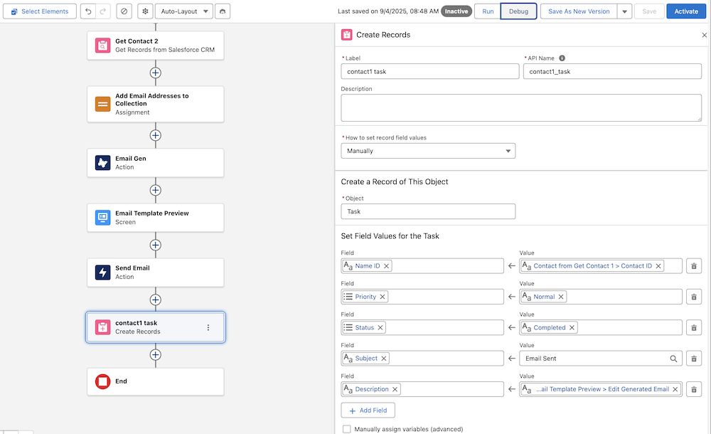 EmailListvariable. - Verify that the AI-generated email is properly sent.