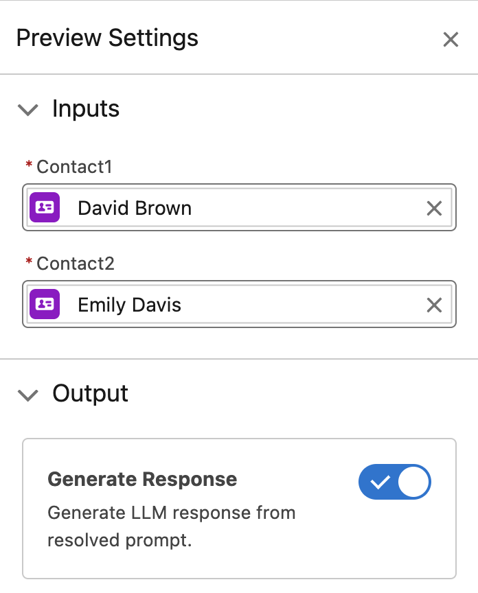 The Salesforce AI Prompt Builder allows you to pull data from objects or enter free text. In this case, we are pulling two Contact records as inputs.