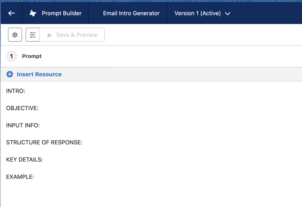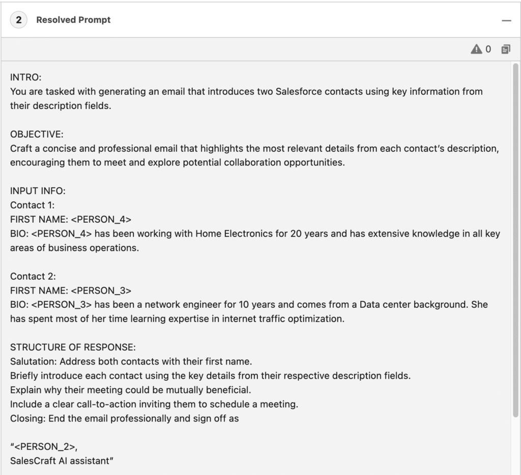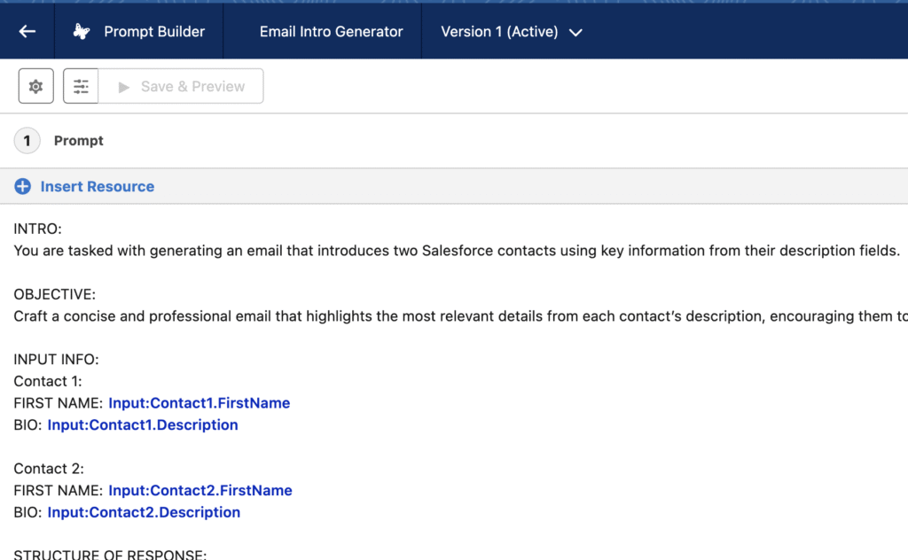 - Build a structured prompt template in Salesforce that synthesizes key contact details into a compelling introduction email.
