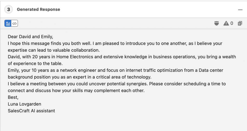 This prompt parses the biographies of two contacts, synthesizes relevant information, and generates a professional yet friendly introduction email.