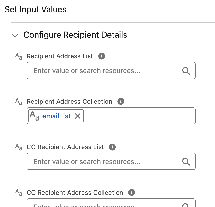 Screen -> Email Template Preview -> Edit Generated Email(the AI-generated, user-edited email). - Recipient Address Collection: This field requires a list of recipient email addresses, which must be gathered into a single text variable. However, those email addresses have yet to be collected into a single variable to add them to this field. Let’s do that now.