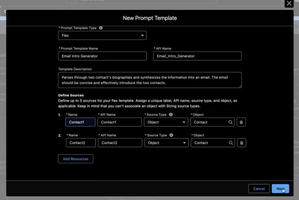 - Build a structured prompt template in Salesforce that synthesizes key contact details into a compelling introduction email.