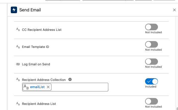 Screen -> Email Template Preview -> Edit Generated Email(the AI-generated, user-edited email). - Recipient Address Collection: This field requires a list of recipient email addresses, which must be gathered into a single text variable. However, those email addresses have yet to be collected into a single variable to add them to this field. Let’s do that now.