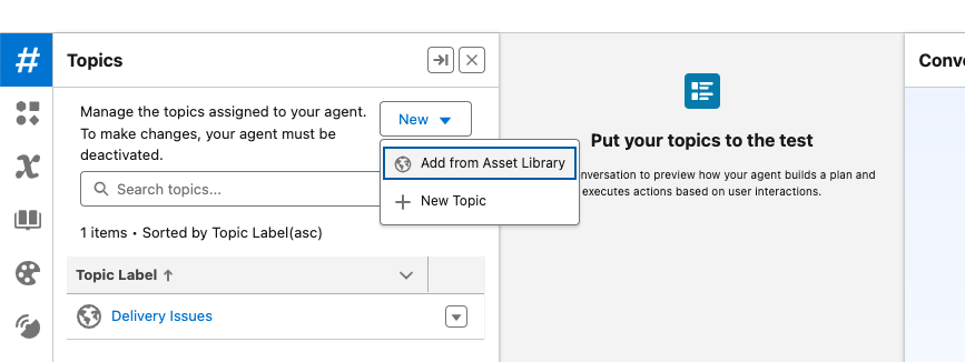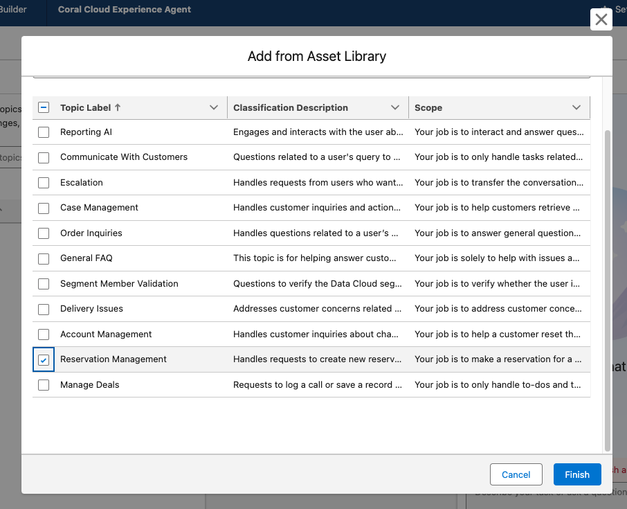 If you’d like, you can follow along by opening a Service Agent inside Agent Builder and adding the Reservation Management Topic from the Asset Library.